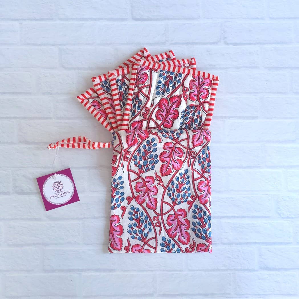 Make cocktail hour unforgettable with our exclusive Blockprint Quilted Coaster Set, featuring a lively leaf print. These charming coasters are designed with vibrant color combinations, accented by chic striped trim and a reversible backing for a touch of elegance. Handmade in India by skilled artisans, the set comes neatly packed in a matching bag, perfect for storage or gifting. Whether enhancing your bar cart or delighting a hostess, these coasters are a functional and stylish addition to any space.