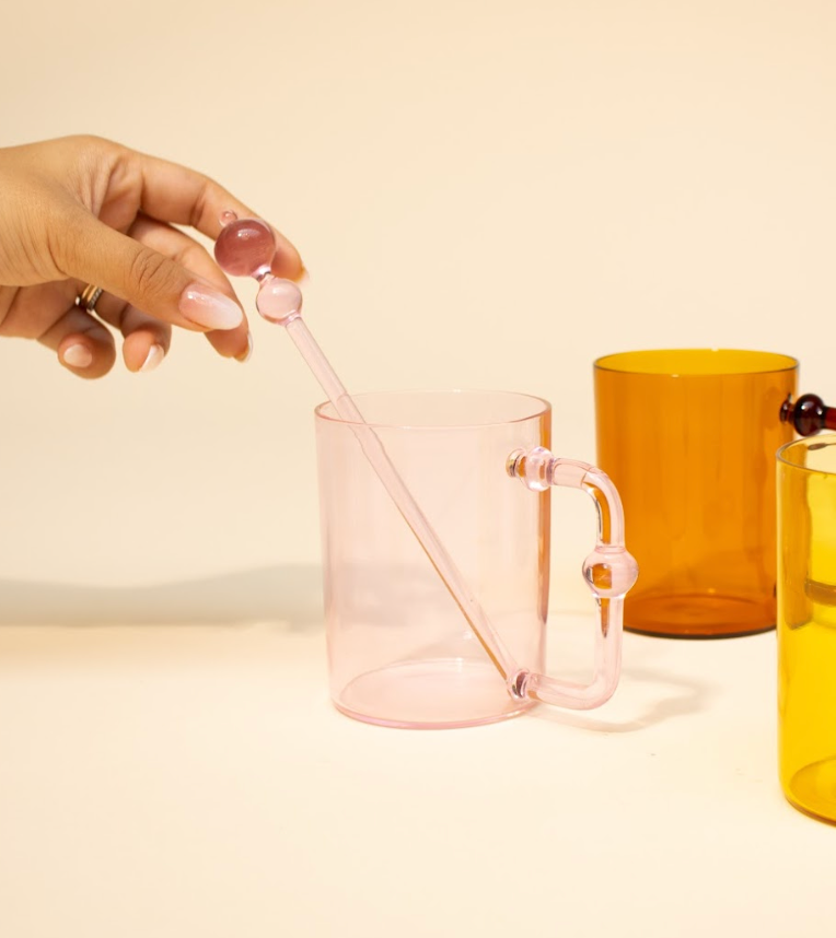 These handblown glass mug with pink color handle are available in a selection of colorful hues, adding a playful touch to your drinking experience. Additionally, they're versatile enough to showcase delectable desserts at your next dinner party, making them an essential part of your entertaining arsenal.