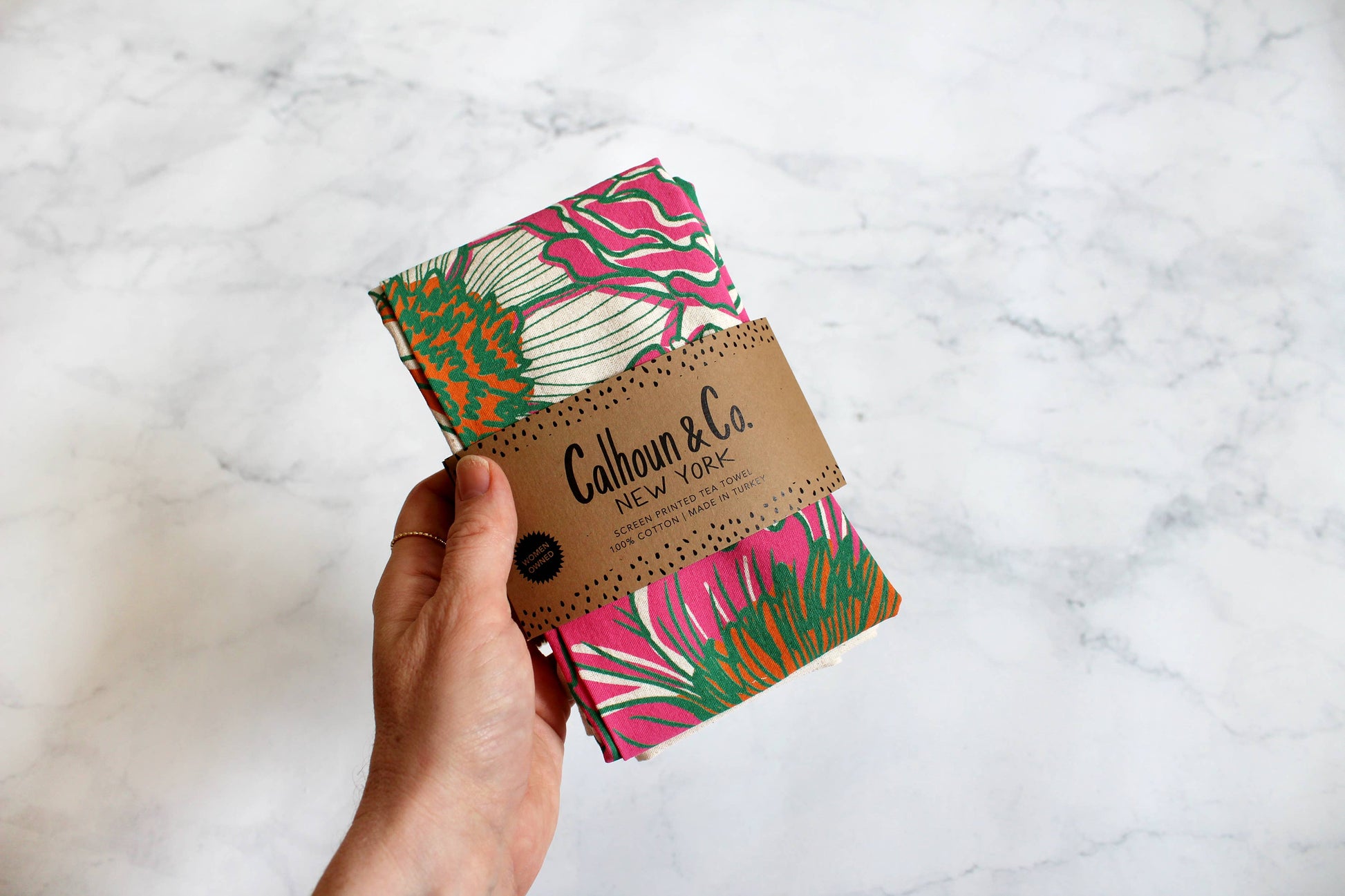 100% cotton tea towel. Oversized Tea Towel is Approx 28” X 28” with hanger loop on back.