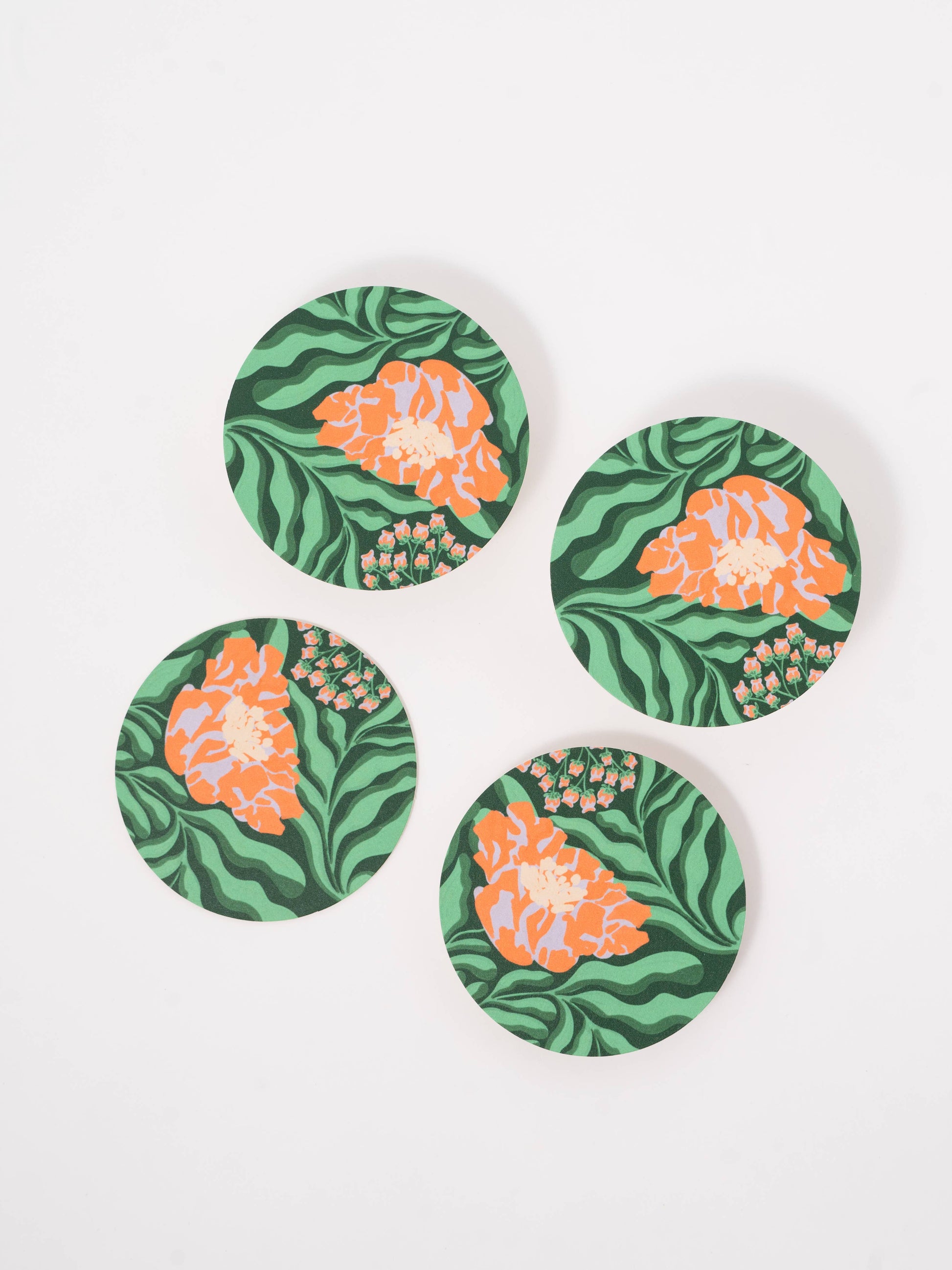 Bring a fresh botanical vibe to your space with this hand drawn orange floral and delicate green vine coaster.