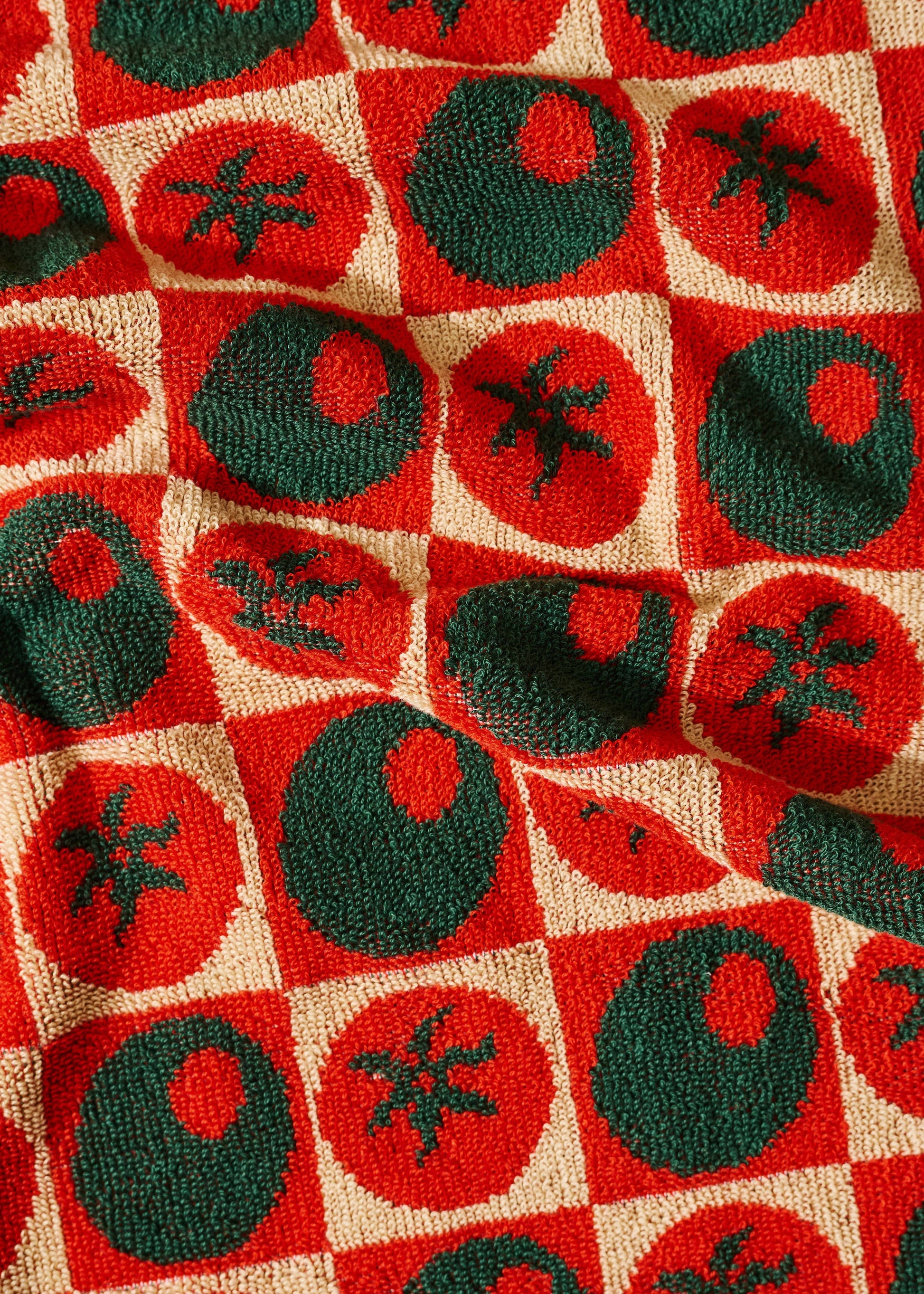 Inspired by summer farmer’s markets and the deep, punchy hues of ripe tomatoes and briny olives. This bold, playful design brings the garden inside with just the right amount of retro charm.