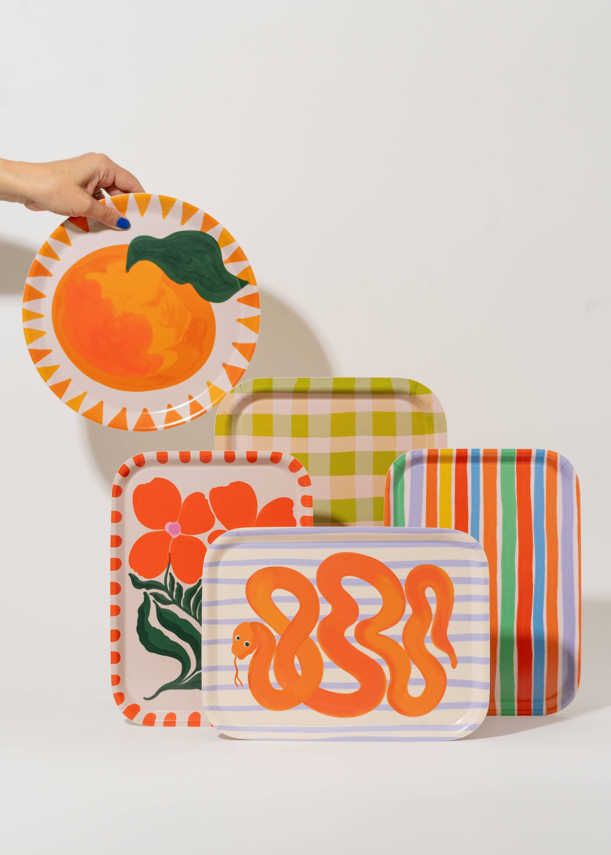 25 cm round (9.8 inch) lightweight tray. Crafted from sheets of sustainably sourced birch veneer, and topped with a custom printed melamine layer, this unique tray is sure to catch your eye.