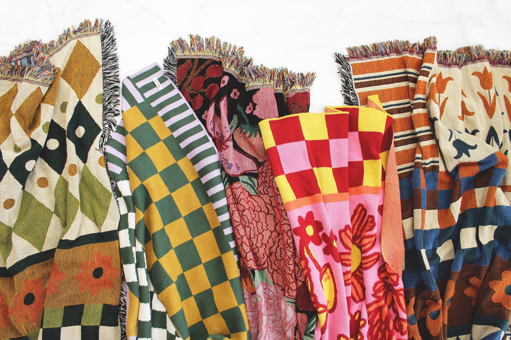 Inspired by vintage wallpaper and patterns. Mix and match and add a playful pop. JUST DANDY DAFFODIL in greens, gold, orange BLUE BELLS in burnt orange, blues, browns Multicolor tapestry blanket.